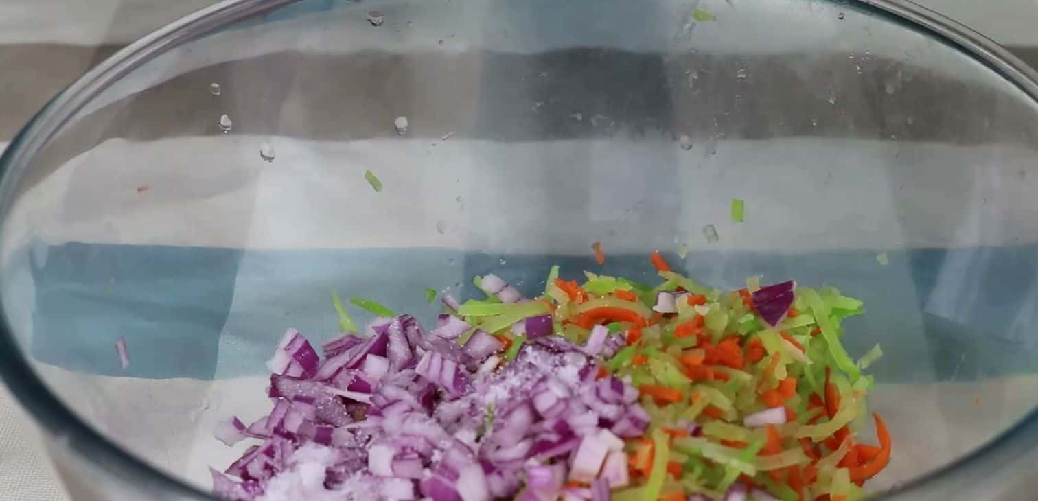 4、萝卜丝焯水两分钟就足够了,时间到了之后将其控水捞出来,倒入清水过凉,挤干水分。接下来用刀把萝卜丝切碎,然后放入碗中。把洋葱取出放到案板上切成无纺布面粉袋生产电话/微信:15838231350碎丁放到碗中。