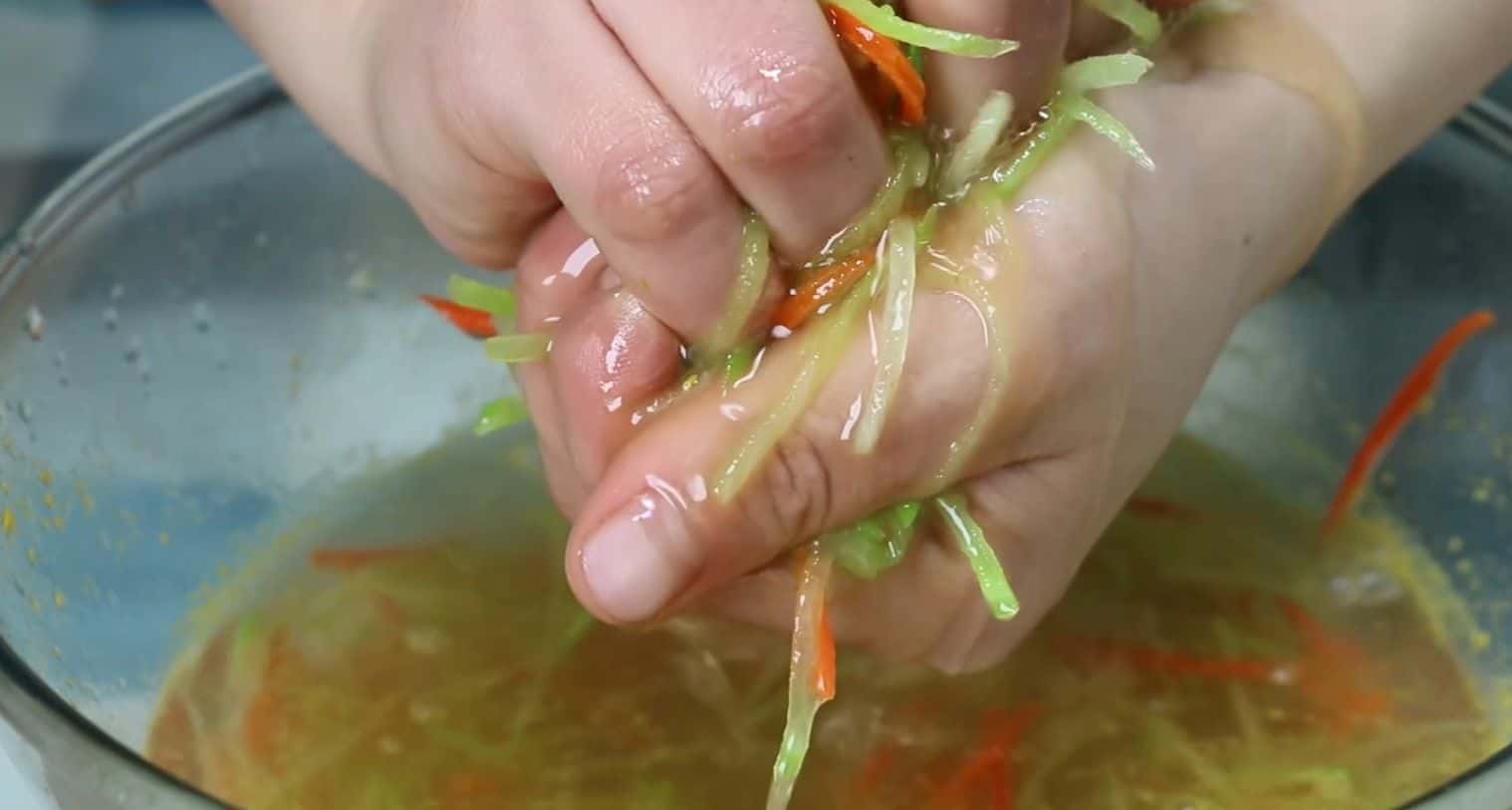 3、将胡萝卜清洗干净去皮,然后用擦丝器擦成细丝,擦完细丝之后放到青萝卜丝中就可以了。在锅中加入半锅清水,然后用大火烧开水,等到水完全沸腾了之后放上一勺食盐,然后把胡萝卜丝和青萝卜丝放进去,加入食盐可以增加底味,而且还可以去除萝卜的气味。