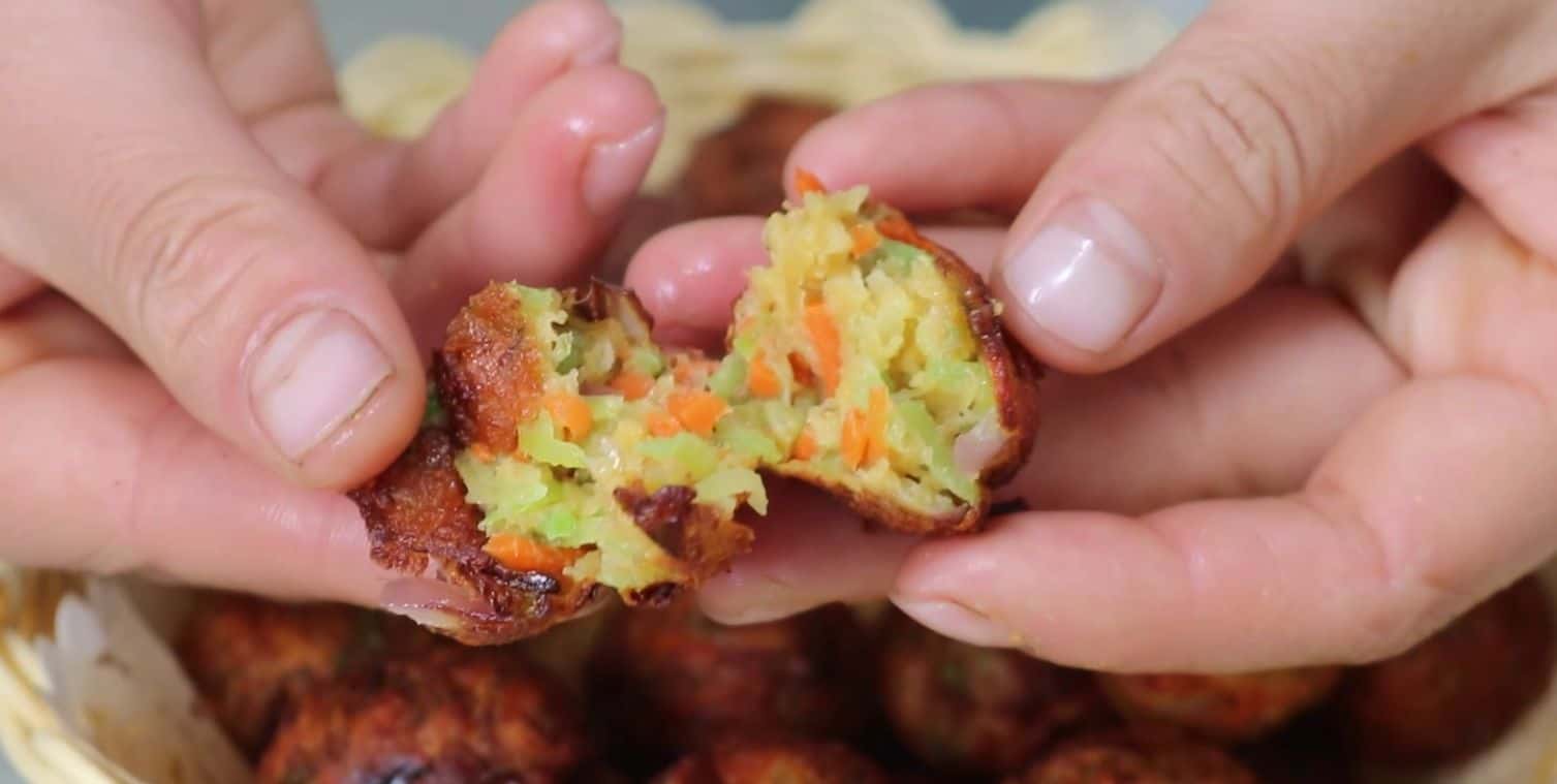6、将它们抓拌均匀之后咱们再抓上一把馅料放在手中搓成丸子,丸子要稍微小一点,不要太大了,太大了不容易熟。锅先烧热多倒上一点食用油,油温六成热,将丸子放进去,先不要着急着翻动,等炸至定型之后再不时地推动一下,让它受热均匀,炸至金黄酥脆控油捞出,全程大约5分钟,然后就可以吃了。
