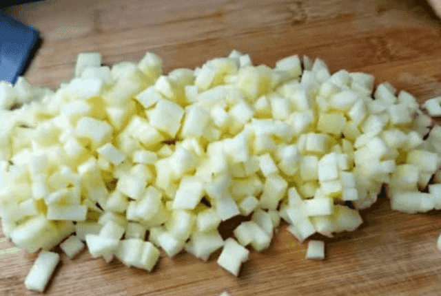 第二步:第二天面团发酵好后,提前1个小时把面团拿出来回温。再准备2个苹果,削去外皮,把苹果核去掉,切成小碎丁,装入碗中备用。