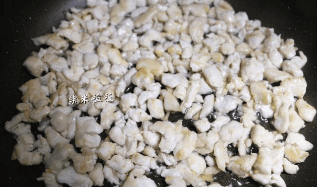 8,热锅凉油,倒入姜丝和蒜末炒香。然后倒入腌好的鸡肉,大火炒至鸡肉变色。