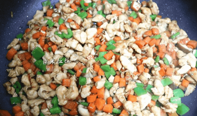 10,倒入香菇和胡萝卜丁,大火快速翻炒均匀。
