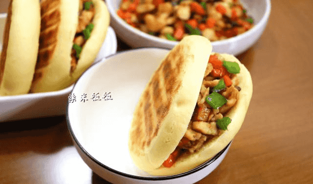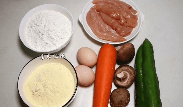 【玉米饼鸡肉夹馍】【食材】面粉150克、玉米面粉150克、酵母3克、白糖、鸡胸肉、胡萝卜、鸡蛋、香菇、青椒、淀粉【调味料】料酒、盐、葱、姜、生抽、蚝油、老抽