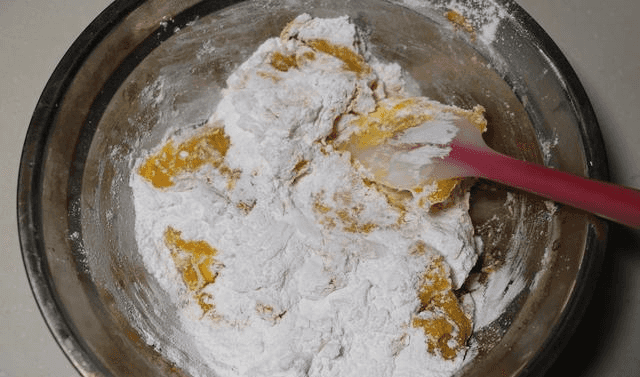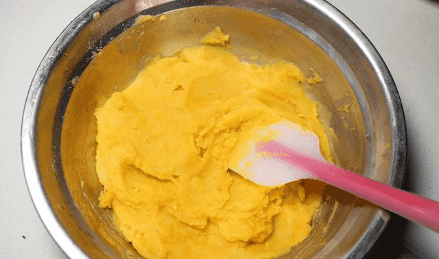 3,红薯泥压好后,立即倒入150 g 糯米粉,用铲子搅拌均匀至没有干面粉。