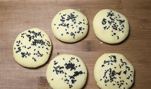 6,把所有的面团全部做成小饼,然后在饼的一面抹些清水,撒一些黑芝麻在上面做装饰。
