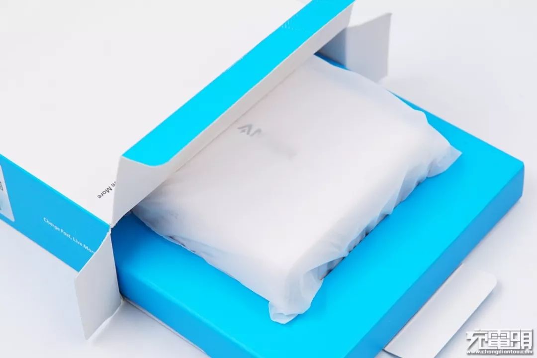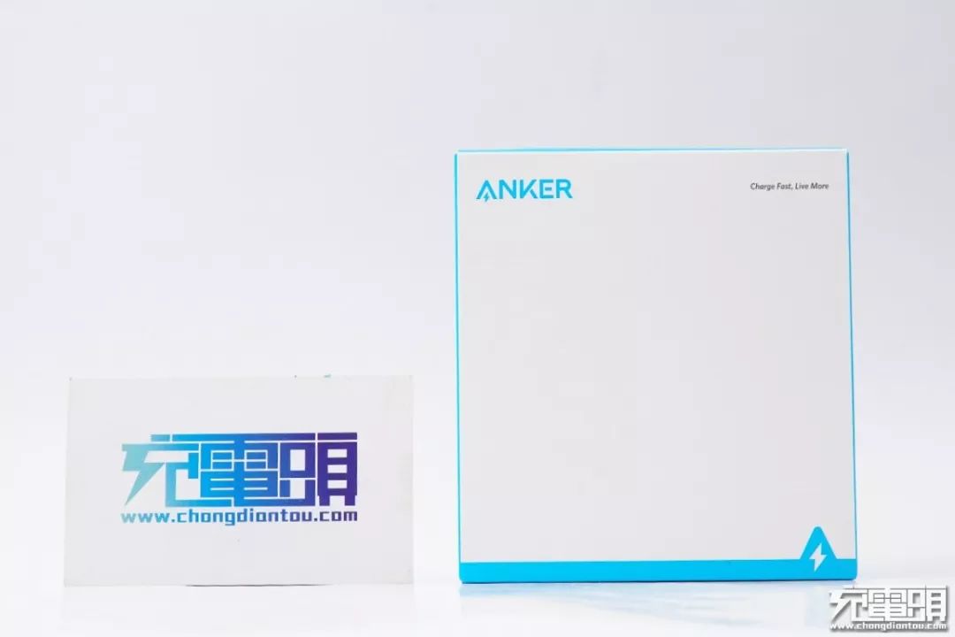 右上角Charge Fast Live More的品牌Slogen,此外包装盒上有很多ANKER产品的压印图案,简洁而不简单。