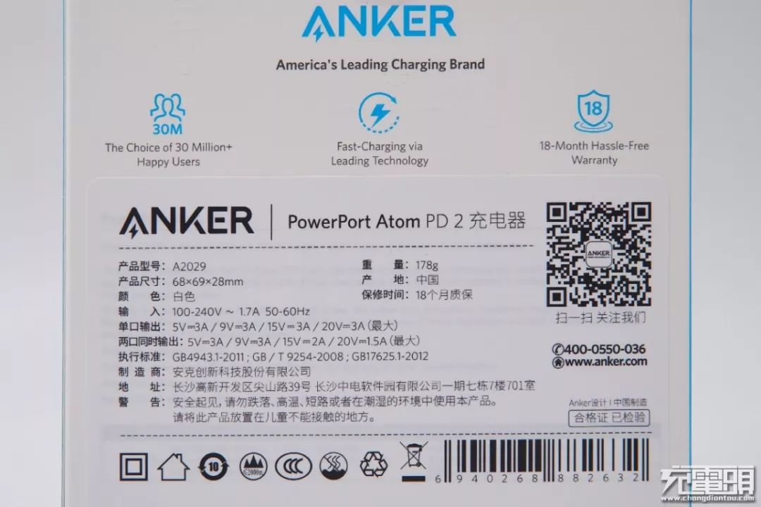 包装盒上的详细参数:名称:ANKER PowerPort Atom PD 2 充电器产品型号:A2029重量:178g产品尺寸:68*69*28mm产地:中国颜色:白色保修时间:18个月输入:100-240V~ 1.7A 50-60Hz单口输出:5V/3A、9V/3A、15V/3A、20V/3A双口输出:5V/3A、9V/3A、15V/2A、20V/1.5A
