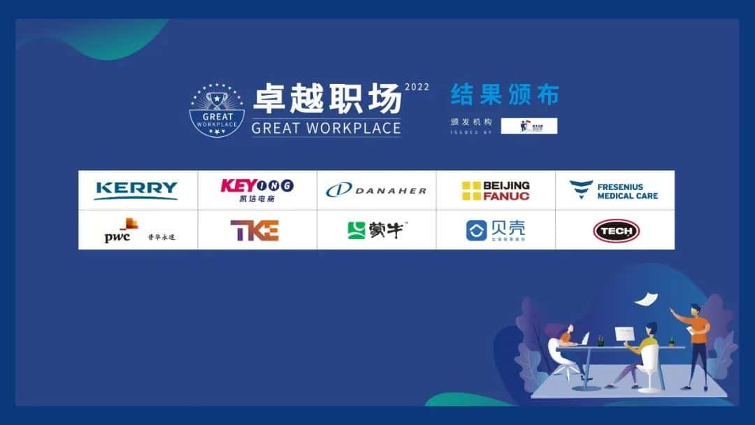 “2022卓越职场”(GREAT WORKPLACE 2022) 专家委员会基于2大审度维度,5项评选标准,历经了科学的遴选。最终,凯爱瑞中国、凯诘电商、丹纳赫集团、北京发那科、费森尤斯医疗、普华永道、蒂升电梯、蒙牛、贝壳、泰克国际这10家领先企业成功摘取桂冠,以此表彰他们在职场建设中所取得的成就。这10家企业重新定义了职场的标准,推动了职场文化的发展与进步。在2022年,本项评选通过企业将被授权使用“2022卓越职场” (GREAT WORKPLACE 2022)标志。