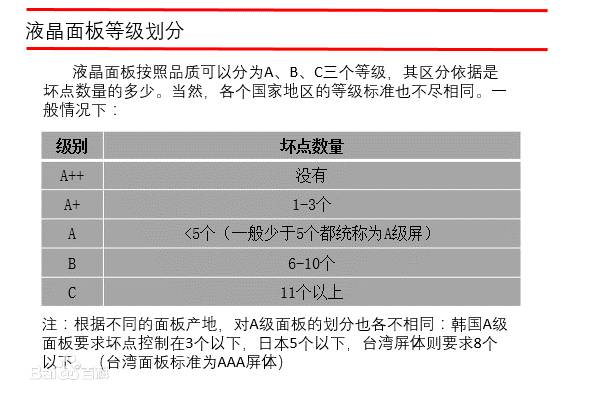 现在的电视技术发展日新月异,什么4K啊,智能啊,语音啊,好多功能我们不走进卖场根本不清楚是怎么回事,听导购员的讲解吧,五花八门的功能讲下来,不仅没听懂,反而更蒙圈。其实,我们选一台好电视不要先被功能所迷惑,我们首先要选一个好的液晶屏,液晶屏选级别最高的,然后才看功能,这样选电视才靠谱。要知道电视机的成本80%是液晶屏,只要屏体选个好的,您的钱才不会白花。那什么样的电视屏幕才是好屏体呢?小编这里教您一个方法,就是不管商场里的导购把他推荐的电视说的多么好,您都让他把电视配置信息给您找出来,所有一线品牌的电视都会有电视的软硬件基本信息。当他打开电视信息后,你看一下屏体信息,如果屏体信息显示是A++,就说明这是一台最高级别的液晶屏,那电视画质和使用寿命肯定是有保障的。如果显示是其他任何字母,或者只有一个+号,都不是最高档次的屏体,您购买的时候就要仔细考虑价格是不是值得了。下图是小编自己百度得到的电视屏体档次对照表,您可以对照一下。