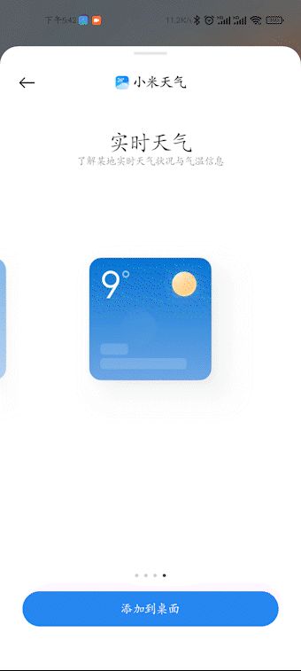 在每一个小部件应用下都有多种显示样式可供选择,比如下图的小米天气就有“多日天气”“今日天气”和“实时天气”可以选择,大小也不一样。