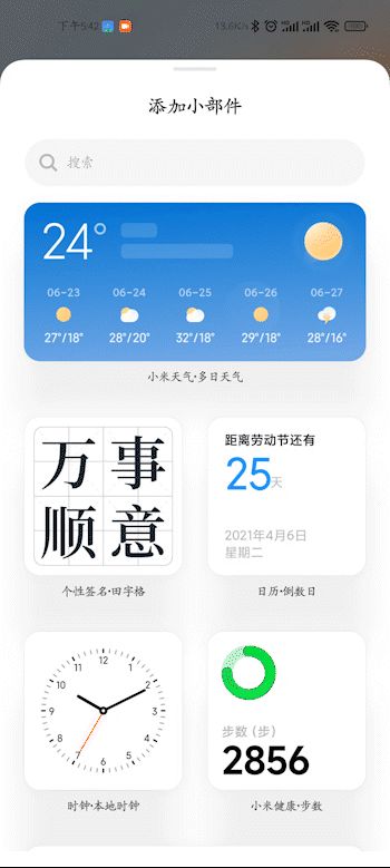 点击这里的“添加小部件”,就会进入一个新的界面,可以选择自己喜欢的小部件添加到桌面。