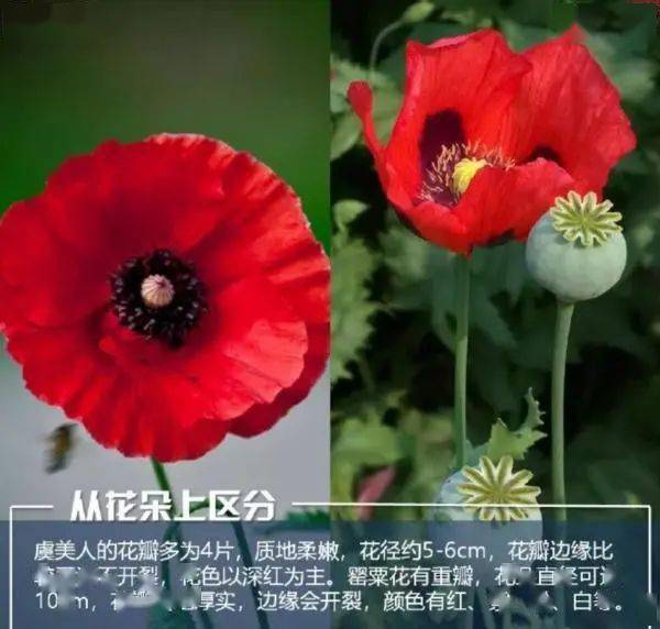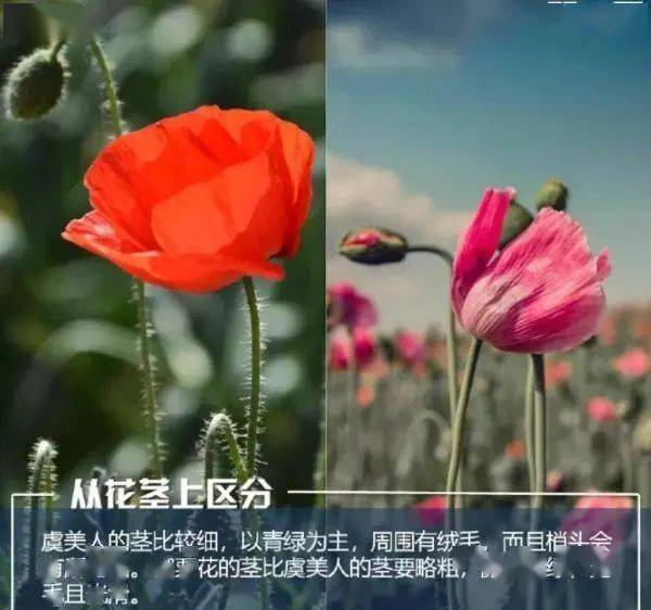 虞美人的花瓣多是4片的,而且颜色各异,有红有紫,也有白色的,且花的边缘比较平滑不开裂。