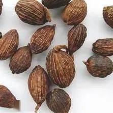 草果的果实呈两头稍尖的椭球形,截面略呈三棱形,而且身上也具有很多凸凹不平的沟槽。草果里面含有几十粒聚在一团、有棱有角小黑石子一般的种子。