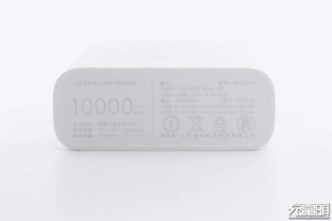 背面印有移动电源参数和制造商信息,并贴有防伪标签。