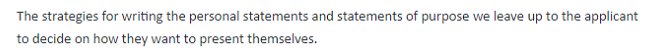 相比简历,个人陈述的素材准备则要更加细节一些,往往也要挑选一到两个比较有代表性的经历着重去表现自己的学术/工作准备,同时在个人陈述中体现为什么申请本专业,为什么申请本学校以及自己未来的职业规划。由于每个人的行文习惯和写作偏好,个人陈述基本没有固定的格式,这点在学校的申请要求中也会有提及。例如Cornell的admission committee 就表示: