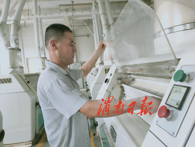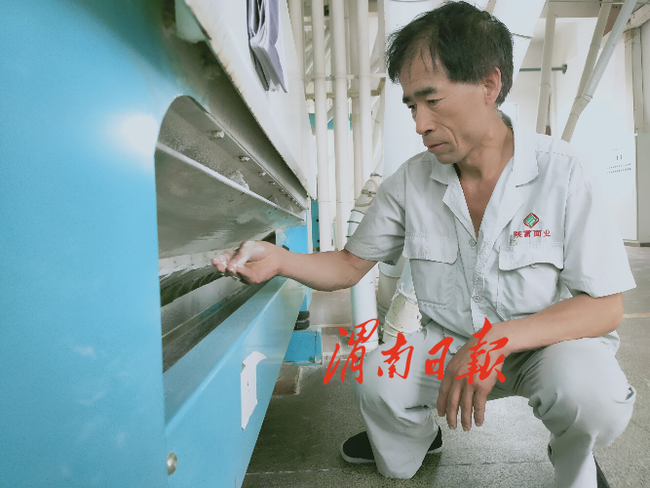 7月10日,位于富平县齐村镇的陕富面业富平公司的生产车间里,伴随着机器的轰鸣声,一粒粒小麦被磨成面粉。制粉车间班长王卫龙不时查看机器、叮嘱工人。