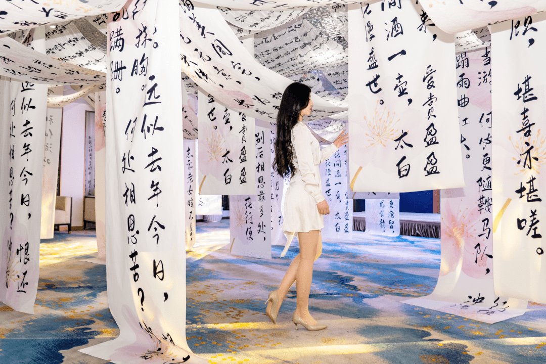 穿行于古色古香的樱花林,拍照打卡的同时也可欣赏樱花美文。错落有致的淡粉纱布朦胧缥缈,既是美文书画展,也像云雾缭绕的迷宫幻境。