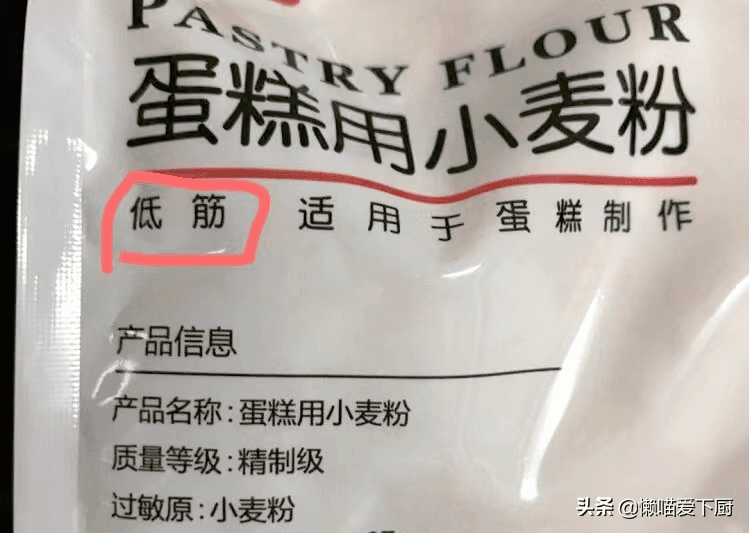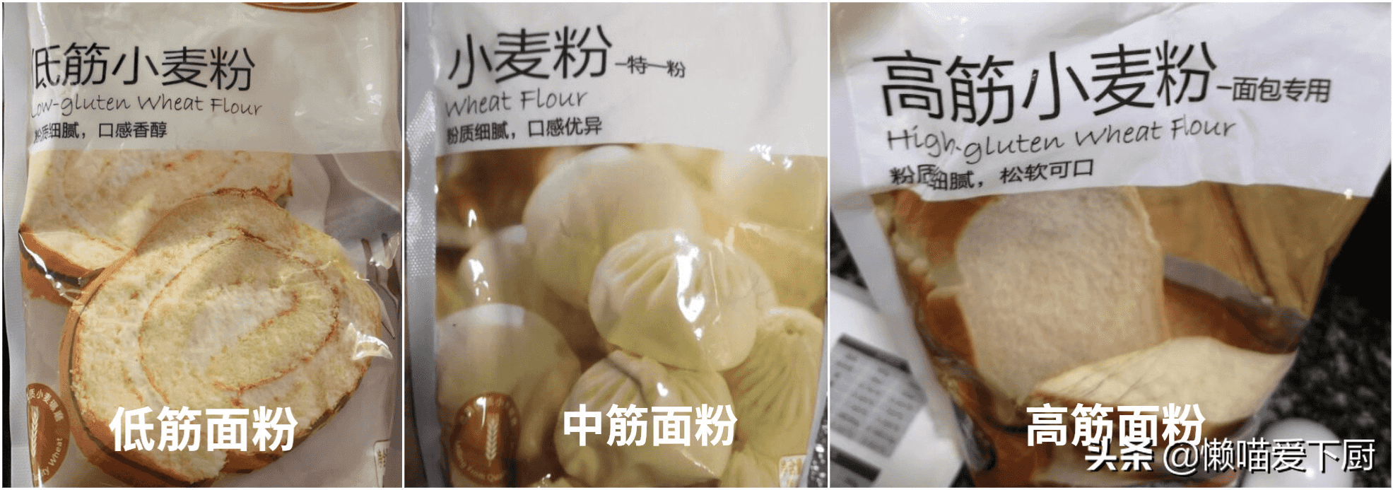 一般来说,超市里售卖的面粉,大致可以分为三类:低筋面粉、中筋面粉、高筋面粉。它们最本质的区别,在于面粉中蛋白质的含量上,依次由低到高。而蛋白质含量的不同,也就导致了面粉在性质上和适合做法上的不同。