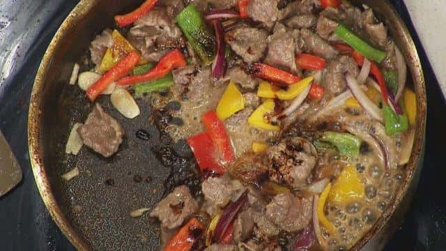 步骤3:锅中少油,牛肉煸炒变色加入葱姜、绿茶水、蚝油、酱油、糖、彩椒、洋葱炒熟即可。