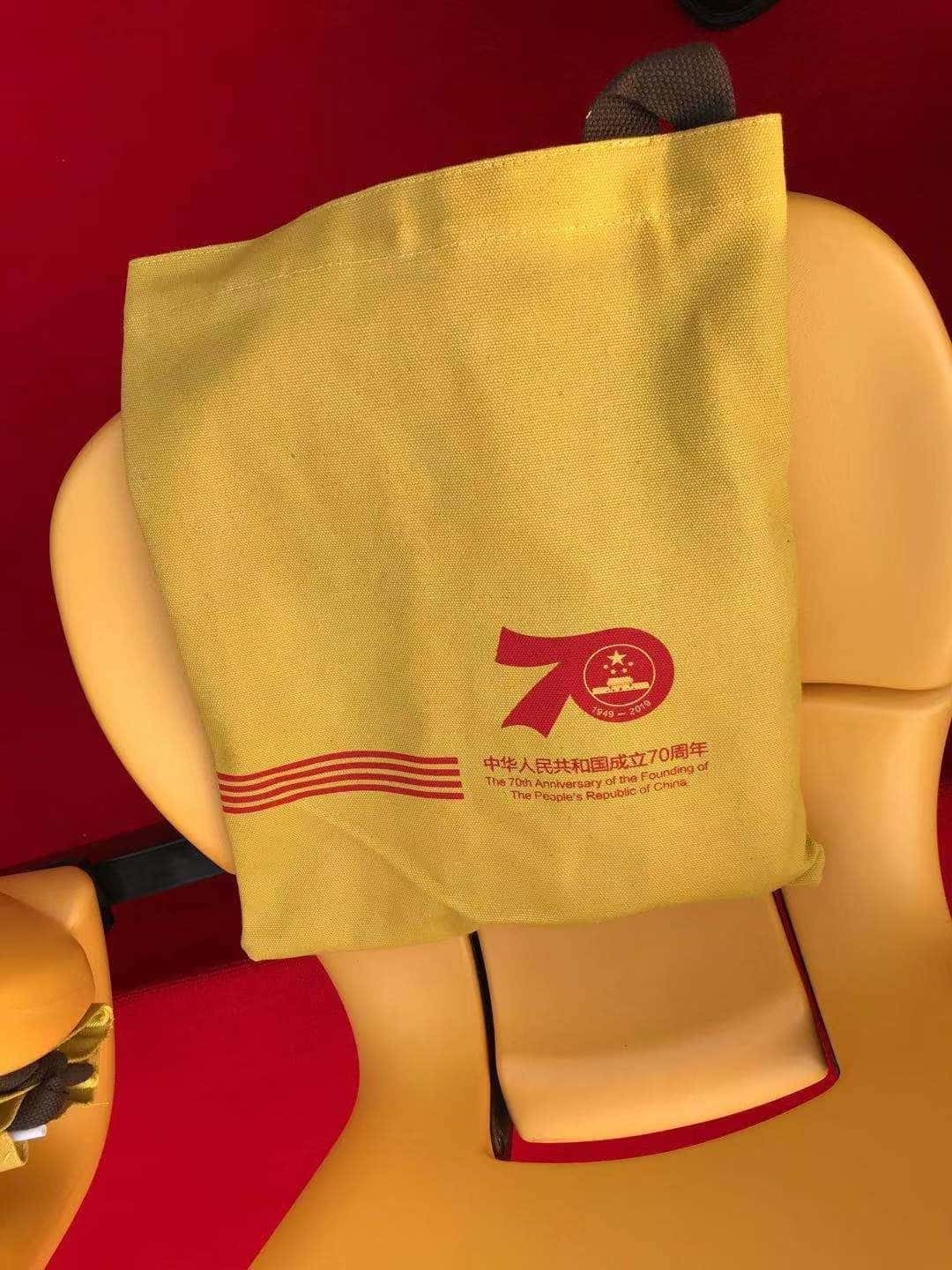 【国庆观礼套装揭秘:纪念帆布包内装多样物品】观礼现场每个座位上都摆有纪念帆布包,内有大庆标识红旗一面,矿泉水两瓶和一包纸巾。