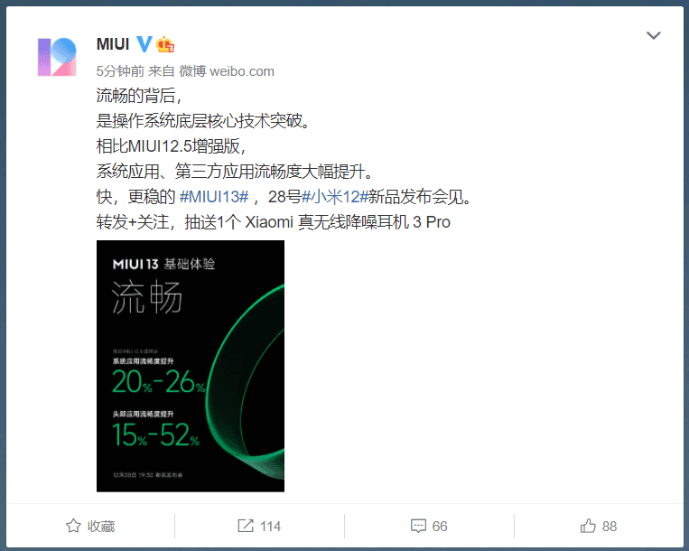 通过微博内容不难发现,这次MIUI13会聚焦基础体验的提升。相比8月份发布的12.5增强版,全新MIUI13在系统应用和三方应用流畅度方面都有了大幅提升。其中系统应用流畅度提升20%—26%,头部三方应用流畅度提升15%—52%,效果非常明显。