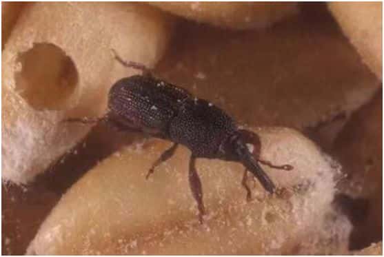 之后米象的幼虫化成蛹,蛹再羽化成虫的时候还会赖在谷粒当中不走。直到米象的外壳骨化程度高,身体硬实了以后就会“破米而出”。