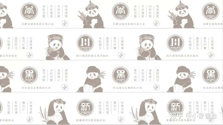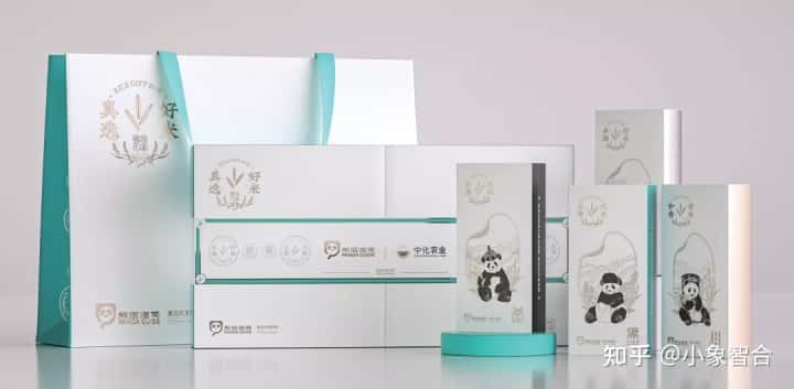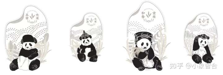 本次的产品——大米,分别来自不同的四个知名的大米产地,提取各省份简称,融合地域元素特征进行字体设计;使用品牌核心元素熊猫“迈迈”,并提取四个省份极具民族特色的帽子作为装饰,让包装更具地方特色、体现亲和力,体现了项目要求的地方特色。